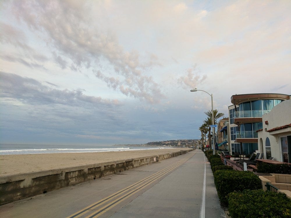 I was considering this while walking down the mission beach boardwalk when, behind me, I heard a shuffling of feet. Before I could turn my head, a short grandmother scooted past me dressed in full power-walking attire: matching sweat suit, thick soled walking shoes, giant sun glasses, and head phones. She had the steely look of determination on her face as she forced her way past me on the paved path. She was cute, she was funny looking, she was determined.